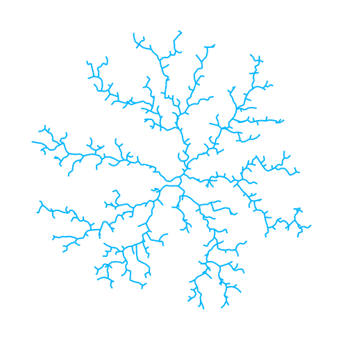 DLA is the clustering of particles undergoing Brownian motion. These fractal patterns frequently crop up in nature — river drainage systems, blood vessel networks, lighting scars (see Lichtenberg Figures).